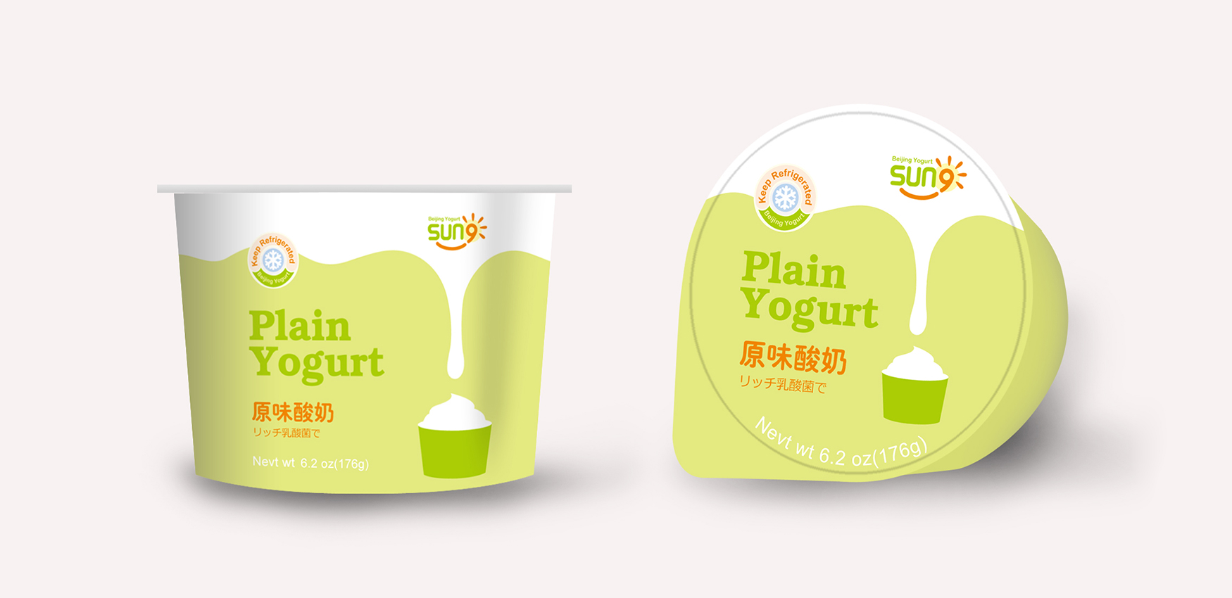 项目背景:北京酸奶是由Prime Plus Food Inc 乳制品工厂在加州生产的,产品遍及加州几百家华人超市和美国超市,是一个为人熟知的品牌。为扩大品牌影响力,计划以简单、现代感强、色彩突出为设计目标的全新包装进入美国市场而退出新品牌。”Sun 9“ 的谐音为酸奶,太阳也代表光明、热情、感召力、醒目等特点,加上数字9 组合在一起形成独特的品牌认知度。