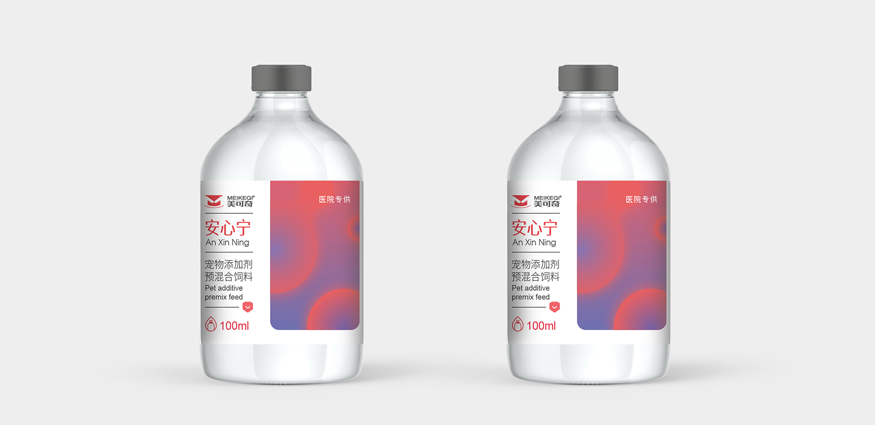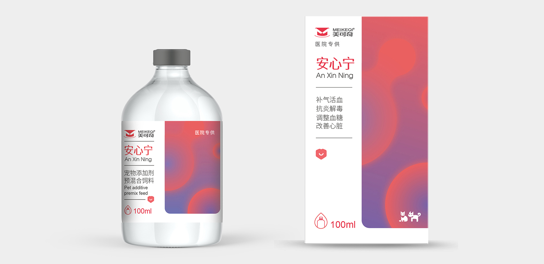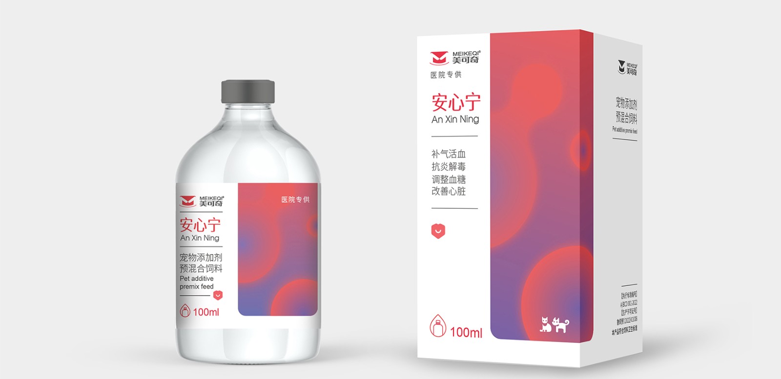 包装说明:安心宁——包装图形部分采用形似分子式的视觉符号,彰显出产品的生物科技感和医药功效属性;色彩渐变形式则提升了现代感和立体感,犹如显微镜下观测到的生物细胞分子,给人一种产品正在发挥功效、补气活血的动感。简约的心脏小图标点缀版面,展现精致的现代感,同时表明产品改善心脏功能的疗效;犬猫小图标则表明了产品的行业属性。整个包装的文字部分排版简约,井然有序;图形部分简约现代,整体主次分明,生物科技感强,具有医药专业及国际品质感。