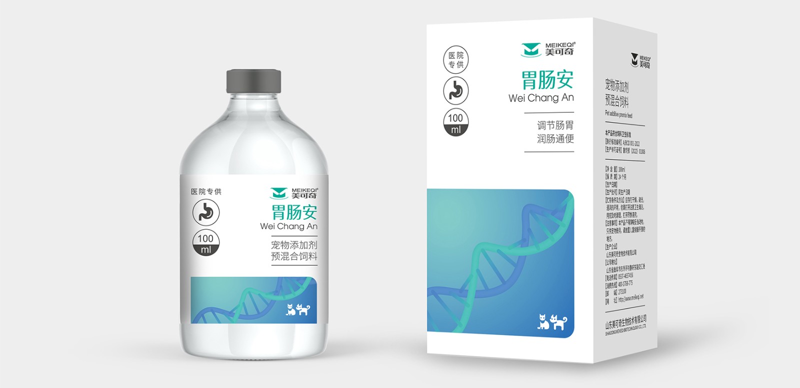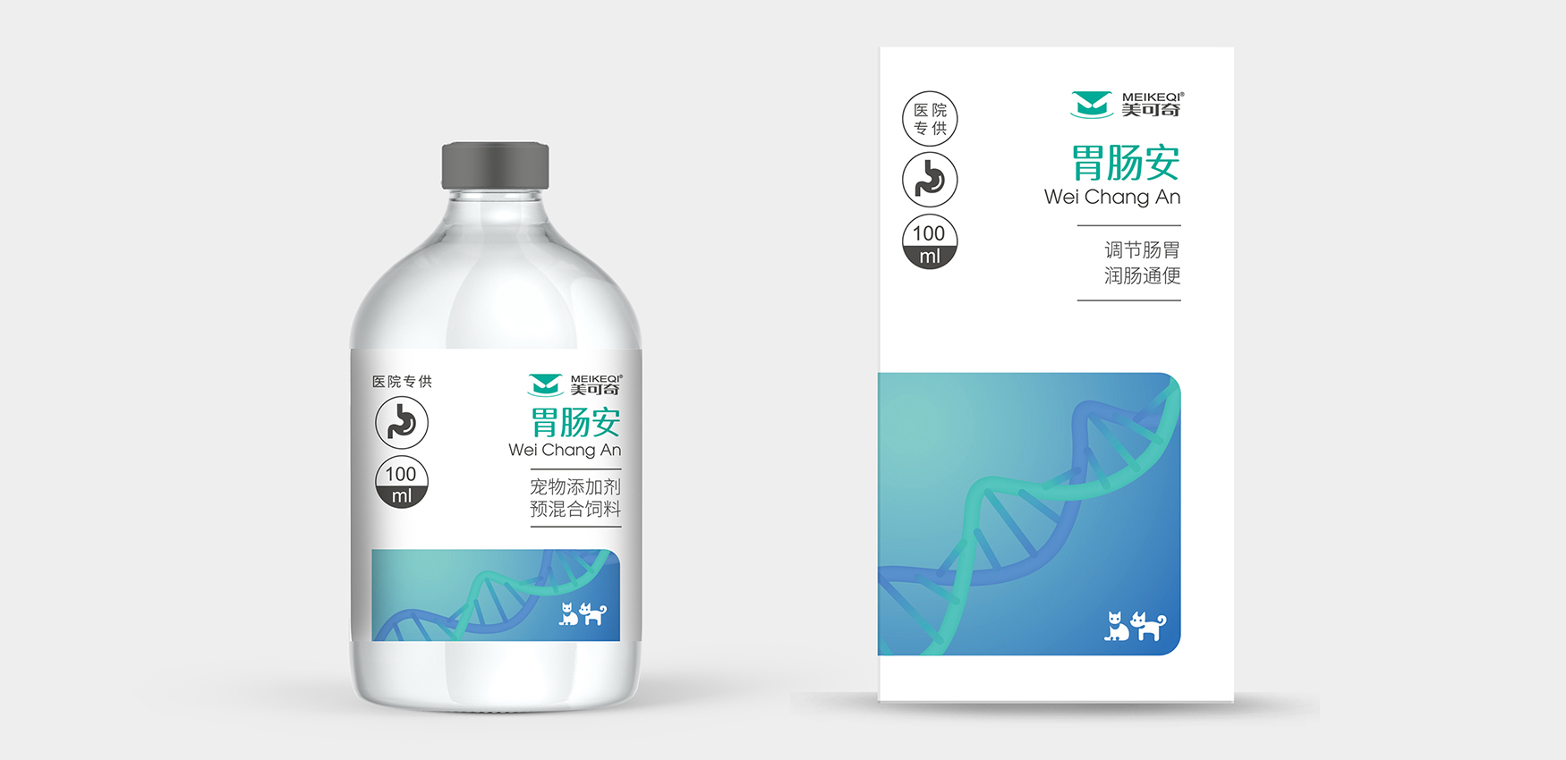 胃肠安——包装图形部分采用DNA基因链的视觉符号,彰显出产品的生物科技感和医药功效属性;色彩清新、形式立体,斜向上的形态增添了动感,给人一种产品正在发挥功效的作用。版面左上角点缀简约圆形图标,形式独特,展现精致现代感,其中肠胃小图标表明产品调节肠胃功能的疗效;右下角犬猫小图标则表明了产品的行业属性。整个包装的文字部分排版简约,井然有序;图形部分简约现代,整体主次分明,生物科技感强,具有医药专业及国际品质感。